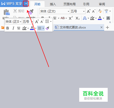 在wps文字程序的左上角点击“wps文字”选项旁边的倒三角。