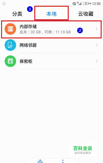 在文件管理中,先切换到“本地”选项卡,再点击进入“内部存储”。