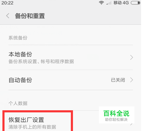 (4)排除了上面的因素还不行,我们就可以直接试试恢复出厂设置了,再不行就需要拿到厂家那里维修,自己不会捯饬的千万不要乱弄。 具体操作:【恢复出厂设置】一般都是在设置里面找到,小米机就是依次打开【 设置】—【 其他高级设置】—【 备份和重置】—【 恢复出厂设置】,最好做好数据备份工作之后再进行这一步。