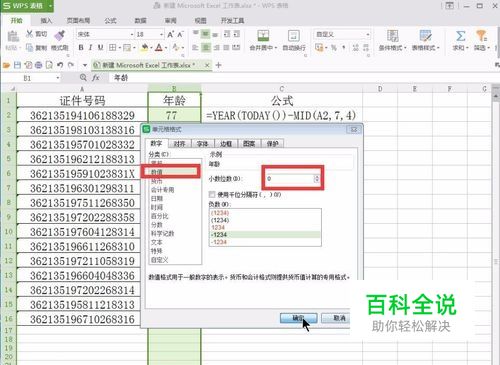 同样年龄这拦单元格格式设置为数值,并且小数点位数为0。