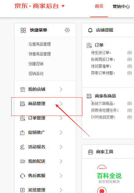 登陆京东卖家店铺,进入后台,点击“商品管理”