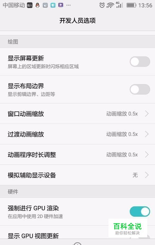 在开发者选项或者开发人员选项里找到“强制渲染GPU”选项,选择打开他,右侧开关位置显示蓝色,表示已经打开。这样可以提高手机的运行速度。