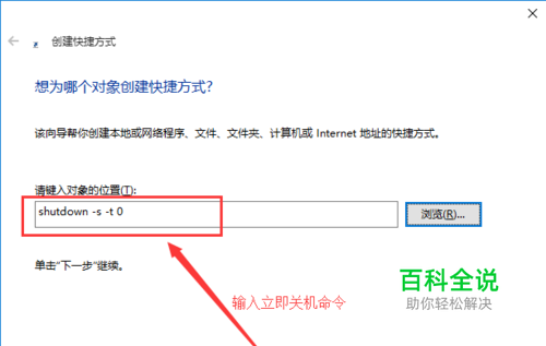 此时弹出“创建快捷方式”窗口,在“请输入对象的位置(T)”都赢得文本框中,输入shutdown -s -t 0实现在0秒后关机,然后点击“下一步”按钮。 这里再简单介绍下几个命令,可以创建相应的快捷方式及快捷键。 shutdown.exe -f 强行关闭应用程序 shutdown.exe -l 注销当前用户 shutdown.exe -h 休眠 shutdown.exe -s -t 时间 设置关机倒计时