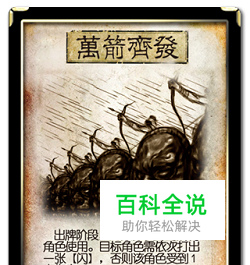 万箭齐发:万箭齐发效果为对除自己的所有人出一张杀,当然每个角色可以用闪躲避。定位为AOE伤害,不分敌我。