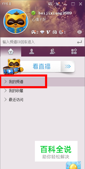 首先输入你的yy账号和密码登录你的yy,因为要直播游戏需要有一个自己的yy频道,如果没有的话可以新建一个,在我的频道上面右击鼠标,选择创建频道