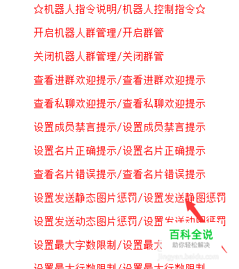 下面就拿第十代QQ机器人的部分指令详细做一个说明。其它商家的机器人指令使用也是类似,因为QQ机器人的工作原理都是这样的。 注意:斜杠[/]前面的只是大致说明,后面的才是正确指令。 就拿下图这个【设置发送静图惩罚】这个为例。