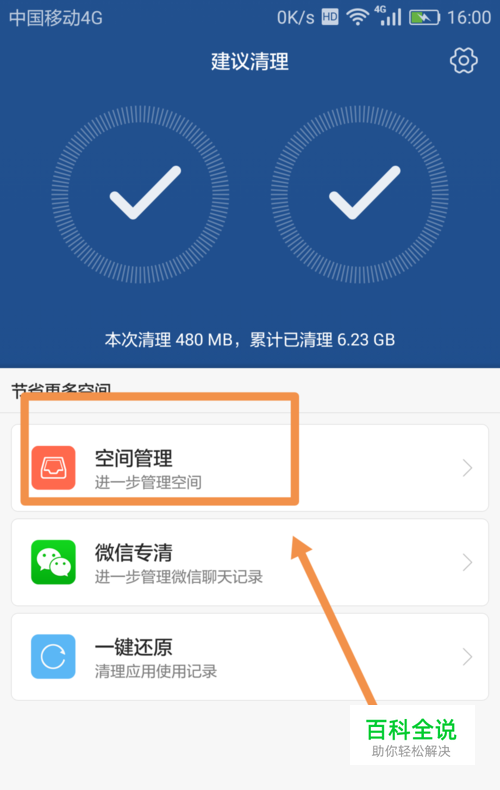 清理加速完成后,在节省更多空间下面,点击【微信专清】功能栏,如图: 注意:如果微信聊天记录很重要,可先将聊天记录进行备份