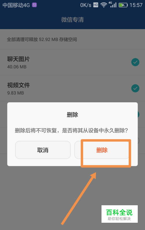 在弹出的提示框中点击【删除】按钮,确认清理,如图: