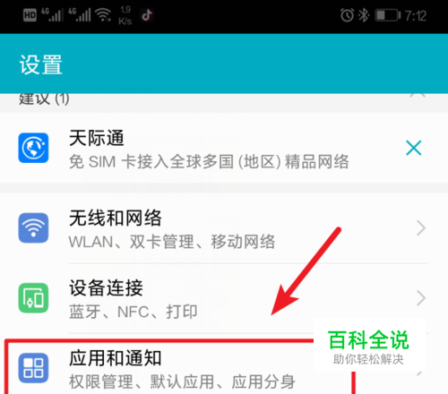 在设置选项内,我们选择页面中的“应用和通知”的选项进入。