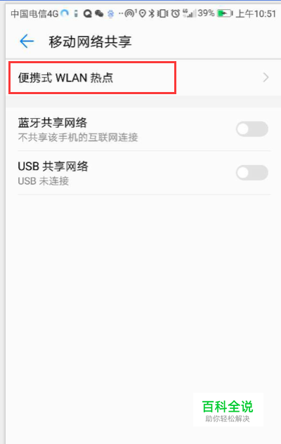 第五,进入便携式WLAN热点后,我们发现它后面的选项是灰色的,我们点击它一下,就可以把它打开,这样就可以分享了。