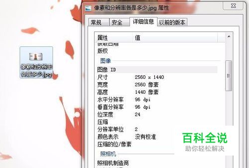 首先,我准备好了我喜欢的一张图片,然后大家可以通过鼠标右键查看图片属性的方式打开图片属性窗口,点击窗口上的详细信息菜单,往下拉就可以看到图片的像素和分辨率了,高度是1440像素,宽度是2560像素,分辨率是96DPI,这个是最快捷的方法。