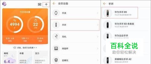 3.打开华为运动健康app,进入“ 设备”界面,点击右上角“+”,点击“ 智能手环”,再点击选择“ 华为手环B5”。