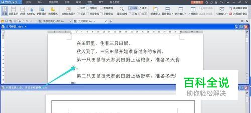 由刚才的纵向排列换成单独一篇排列。如图就显示为三只田鼠文档。如果要换成另一篇文档。 一、只需单击已经缩小成按钮的另一篇文档图标就可切换成别一篇文档显示。 二、单击菜单栏视图按钮,出现一个视图工具栏,里面有很多工具选项,单击里面的切换窗口命令,打开一个快捷菜单,选择另一篇文档就可切换。 三、单击标题栏WPS文字按钮,打开一个子菜单,选择打开命令中的另一篇文档单击即可。 四、单击标题栏WPS文字旁边的下拉列表按钮,可打开一个子菜单,单击里面的窗口按钮,在下一个快捷菜单里单击另一篇文档。