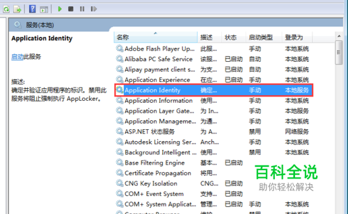 在打开的服务窗口中首先找到Application Identity服务,然后双击打开。
