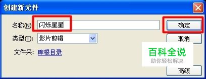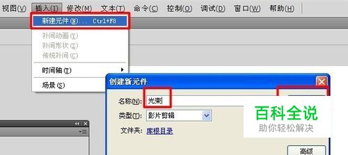 接着针对图片中需要增添动态部分的位置,利用Flash来创建动画。打开Flash,新建一文档,点击“插入”->“新建元件”,在弹出的窗口中输入“光束”,点击“确定”来创建一个影片剪辑。