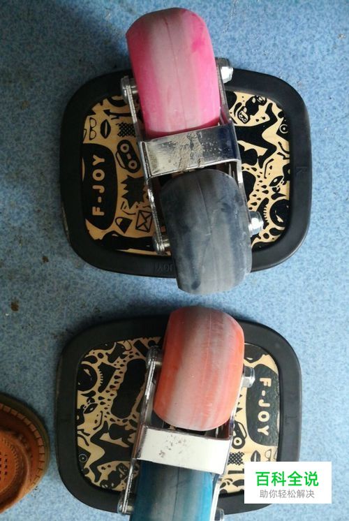 然后,看漂移板的轮子的颜色,如果是四个颜色的漂移板,粉红色的轮子在的是左脚,蓝色轮子在的是右脚。