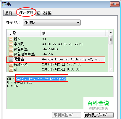 复制出证书颁发机构的证书名称 打开证书,选择" 详细信息"标签页,选择" 颁发者",复制下面的CN内容。如:本文问题证书的颁发者证书是"Google Internet Authority G2"。