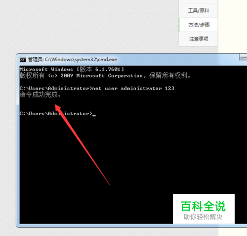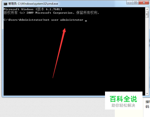 接着,我们在出现的cmd命令框中输入net user administrator 密码(自己写密码),如下图所示: