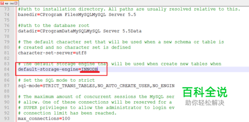到MySQL的安装目录下找到my.ini,用编辑器打开,找到default-storage-engine=INNODB,将INNODB修改为MYISAM