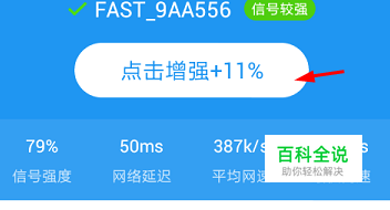 首先打开手机桌面上的wifi信号增强器软件界面,可以看得到信号强度、网络延迟、平均网速、最快网速这些情况,信号不好,可以点击增强信号,如图所示