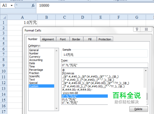 2、打开“设置单元格格式”对话框,选中“自定义”,在“类型”下面输入:0"."0,"万元",确定即可。如果不需要显示“万元”两个字,可以删除"万元",即:0"."0,。结果如下图所示。