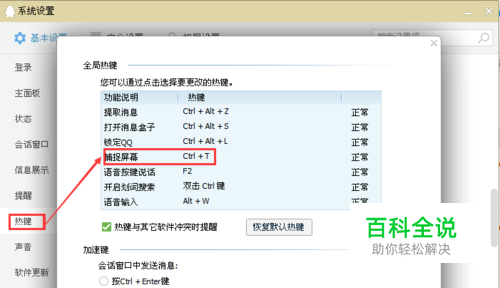 打开并登陆QQ,在QQ界面最底部有个打开系统设置(那个“齿轮形状的”东东),点击打开,会进入到系统设置界面。滑动右边滚动条到热键位置,会显示”热键:您可以通过点击选择要更改的热键。【设置热键】”点击【设置热键】,会进入到热键界面。自己需记住捕捉屏幕的热键是什么。之后点击右上角“×”关闭对话框,即可。