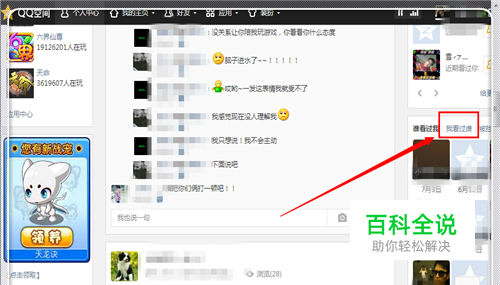 进入自己的qq空间之后,在右方的中间,有一个显示访问的栏目,一个是“谁看过我”,另一个是“我看过谁”,如果想删除不想显示的访客,用鼠标指着这个访客,在该访客头像右上角会出现一个“x”点击即可选择“删除”;删除自己访问别人的空间记录,点击“我过谁”。