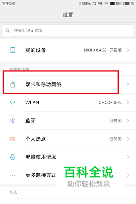 进入设置页面之后,选择双卡和移动网络,如图所示