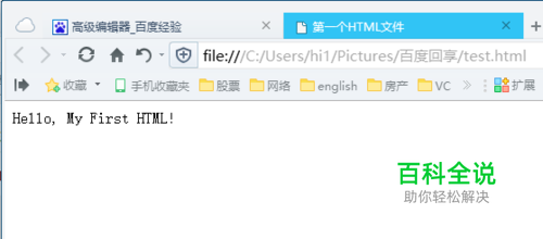 标题标识对<title></title>,其内部的内容为显示的标题.标题标识对出现在文件头标识内部. 注意检查窗口第一行. <html> <head><title>第一个HTML文件</title></head> <body> <p> Hello, My First HTML!</p> </body> </html>