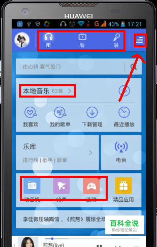 首先我们先打开酷狗,进入主页面。在这里我们可以看见酷狗的主页面中有很多功能,上面分为“听、看、唱”三个板块。再下面是收缩框,还有本地音乐等等功能。在下面我们还可以使用收音机、铃声下载、游戏等功能。如图: