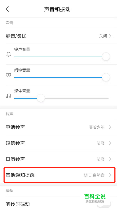 在声音和振动页面,点击“其他通知声音提醒”,点击进入