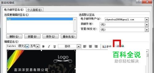 点击编辑栏的“图片”图标,插入你的名片扫描件!如果你不喜欢自己的名片,可以自己在红框范围内自己随便编辑内容,如下图2。同时选择在新邮件或答复回复时是否选择插入签名!如下图3,很重要。设置完毕!点击“确定”