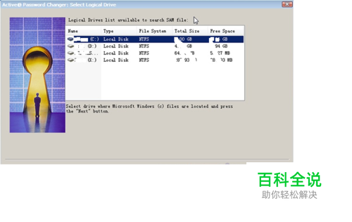 出现如下界面。第一个选项是自动搜索密码文件所在的系统分区,第二项是手动选择密码文件所在的系统分区。如果知道Windows系统安装分区是什么盘时选择第二项。如果你不清楚系统是装在哪个盘,可以选择第一项。这里选择第二项。