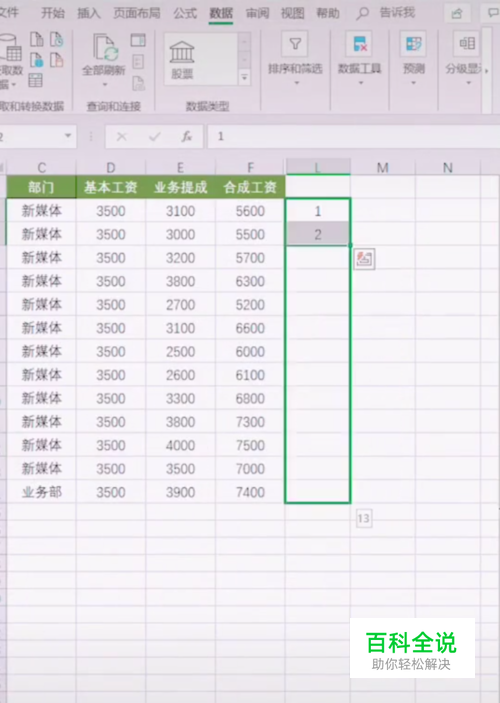 第一步:打开自己要做的Excel文本,在最后一列输入数字“1、2”,然后拖动右下方的黑色十字,给每个员工后面加一个编号。
