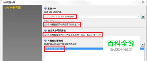 点击”下一步“,出现URL和服务器的配置页面,如图,输入需要测试的URL 特别说明: 在“起始URL”下面输入需要启动扫描的URL,如果勾选了“仅扫描此目录中或目录下的链接”(如下图),则会只扫描起始URL目录或者子目录中的链接。 举例:如果我们的网站www.sina.com.cn下面有两个目录test1和test2,当起始URL中输入"http://www.sina.com.cn/test1/"并勾选“仅扫描此目录中或目录下的链接”的时候,appscan不会扫描“www.sina.com.cn/test2”目录下的所有链接。 另外,如果被扫描对象的主机是unix或者linux,建议勾选下面的“将所有路径作为区分大小写来处理(Unix、Linux等)(T)”选项(如下图),因为unix或者linux是对大小写敏感的;如果被扫描对象的主机是windows主机,则没有必要勾选此项。 如果扫描的时候需要顺便扫描其它的服务器或者域,则需要在底下的“其它服务器和域”中添加对应的路径,如下图所示: