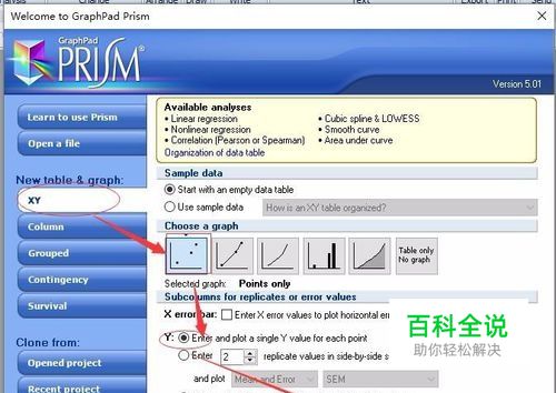 打开Graphpad软件,选择【XY】,选择【choose a graph】项下第一个图,再点击Y:Enter and plot a single Y vlaue for each point.,再点击【creat】。