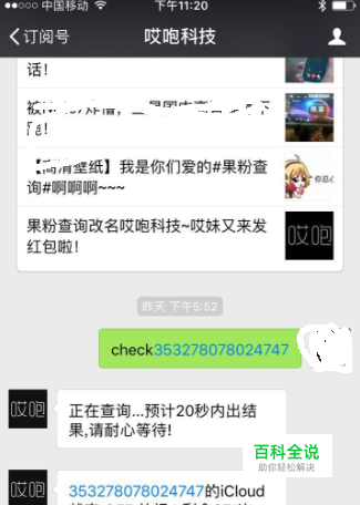 首先在搜索【哎咆科技】微信,然后在里面回复“check321456789012345”,其中321456789012345就是你手机的IMEI码,通过拨号“*#06#”获得。