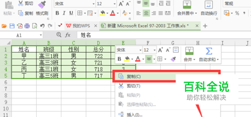 首先选中表格所有数据,单击鼠标右键选择【复制】,快捷键是Ctrl+C。