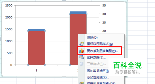 任意选择其中一个系列柱子,在上面右键单击,菜单中选择更改系列图表类型。