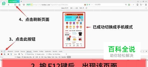 在如下图页面中,点击第3步中的箭头指向处,(即切换成手机浏览模式);再点第4步中的箭头指向处,(即刷新当前页); 此时,已开启手机浏览模式