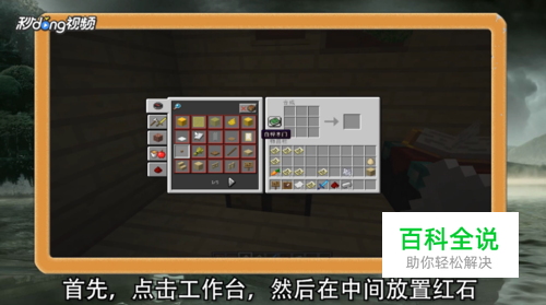 点击工作台,在中间放置红石,在红石的周围放置四个铁锭,这样可以合成指南针。