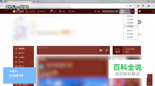 打开个人QQ空间,将鼠标放置在右上角“设置”按钮上,在“设置”按钮下点击“权限设置”。