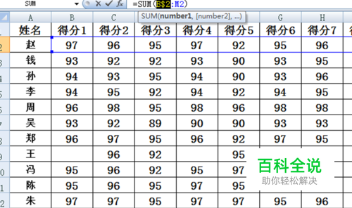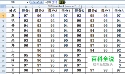 比方说在单元格p3里显示b2:m2区域的和值,我们在复制的时候要把公式中的地址修改为$b$2:$m$2.因此在单元格p3里输入公式为=sum($b$2:$m$2)。