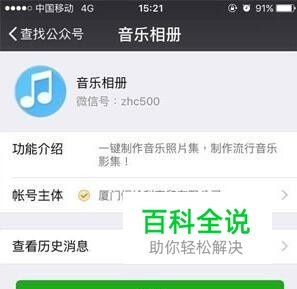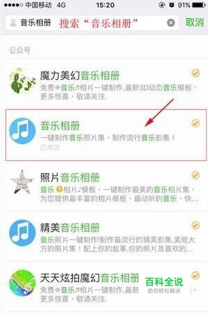打开微信,点击在主界面的右上角“+”添加好友,搜索公众号,在搜索栏里输入 点击搜索,在搜索的结果中点击 公众号。来到音乐相册主页,点击 关注