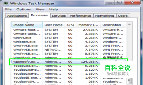 打开任务管理器,找到WPS的进程“ wps.exe” 如图