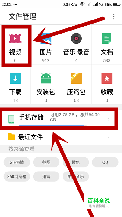 打开手机的文件管理程序,明明下载好的视频却找不到,视频时“0”,可是手机存储64G,只用2.75G可用。