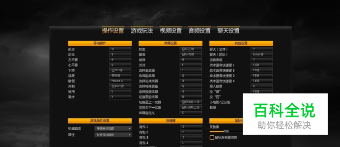 下图为系统默认操作大全,除了卧倒的被我改成了mouse 4键,就是鼠标的侧键,其它都是默认的,如下图:
