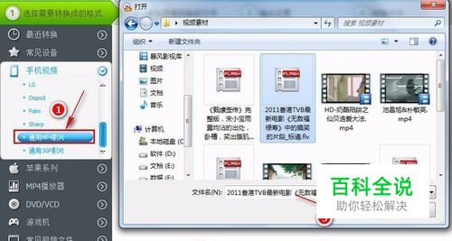 在左边选择需要转换成的格式,因为要转换成手机支持的格式,所以我这里选择“手机视频”,可以看到这下面有很多手机的品牌,找到并选择自己手机的品牌,如果没有你的手机品牌则选择“通用MP4影片”,再点击“添加文件”按钮,打开并添加所需要转换的视频,这里是可以批量添加的。