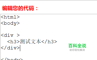 新建一个html源文件,输入如下代码,由于div标签未加任何修饰,显示的测试文本默认为黑色: <html><body> <div <h3>测试文本</h3></div> </body></html>