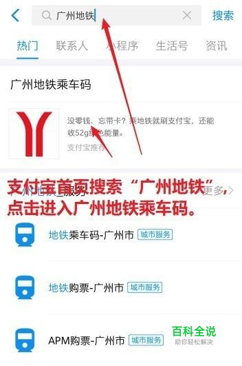 支付宝首页搜索“广州地铁”,点击进入广州地铁乘车码。